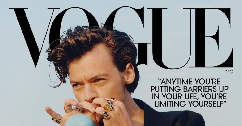 Ο Harry Styles φοράει ένα φόρεμα του Οίκου Gucci στο εξώφυλλο του περιοδικού, ενώ στο εσωτερικό της Vogue ποζάρει με άλλα γυναικεία ρούχα υψηλής ραπτικής.