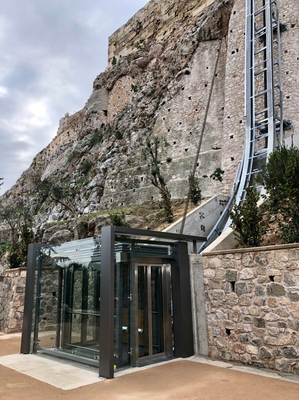 Έχει πιστοποιηθεί από τη διεθνή εταιρεία TUV, όπως ορίζουν οι Ευρωπαϊκοί Κανονισμοί σχετικά με τους ανελκυστήρες πλαγιάς. Σημειώνεται ότι ανάλογος ανελκυστήρας δεν υπάρχει σε άλλο μνημείο. Είναι ο μοναδικός παγκοσμίως επειδή κατασκευαστικά η μεταβλητή γωνία του πλησιάζει την ορθή, ενώ η περιμετρική γυάλινη επένδυσή του προσφέρει μοναδική πανοραμική θέα.