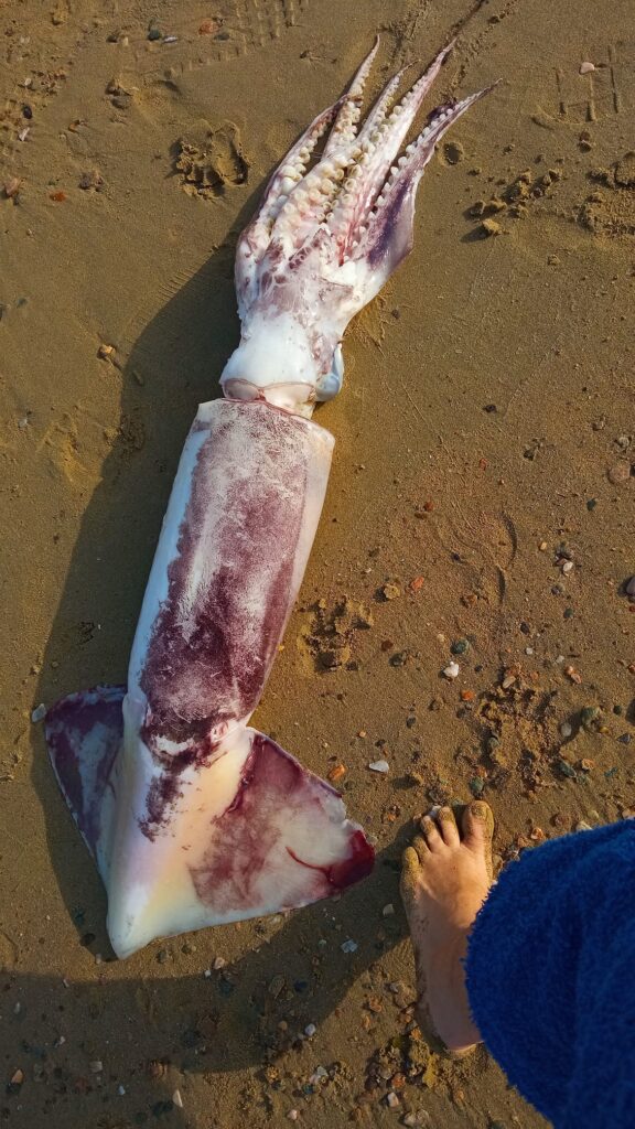 Περιπατητές στην παραλία είδαν μπροστά τους το νεκρό γιγαντιαίο θράψαλο στην ακροθαλασσιά και αμέσως έδειξαν ενδιαφέρον μιας και δεν συναντά κανείς συχνά καλαμάρια τέτοιου μεγέθους.