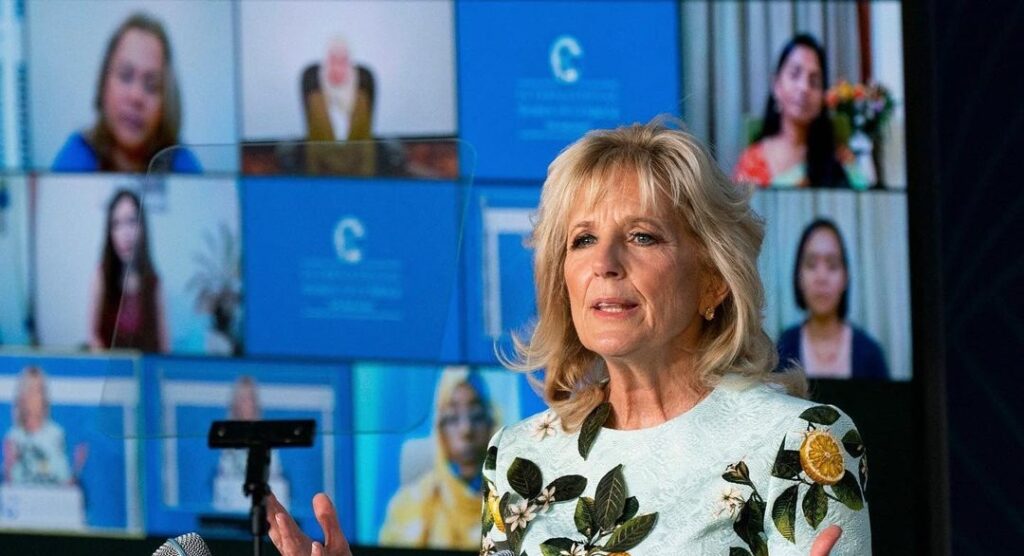 H νέα Πρώτη Κυρία των ΗΠΑ, Tζιλ Μπάιντεν, εμφανίστηκε την Παγκόσμια Ημέρα της Γυναίκας με φόρεμα του οίκου Oscar de la Renta.