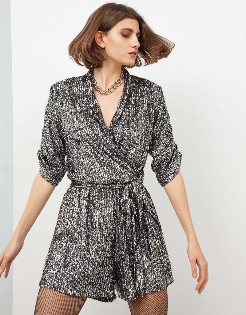 Η διάσημη τραγουδίστρια είχε φορέσει ένα ολόσωμο σορτς με παγιέτες, το οποίο ήταν κρουαζέ και έδενε στο πλάι.
