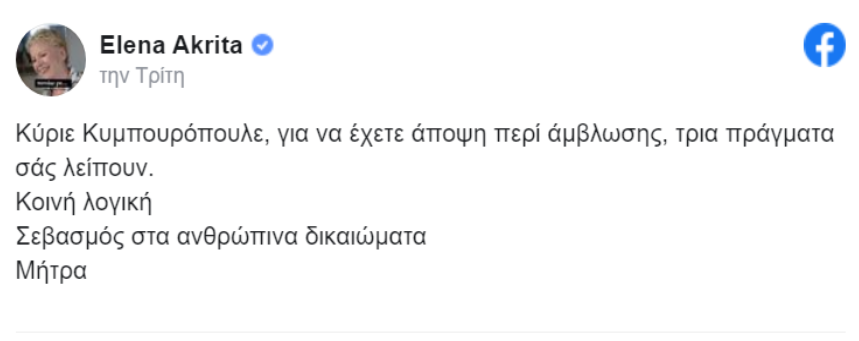 Η δημοσιογράφος Έλενα Ακρίτα έκανε μία ανάρτηση στον προσωπικό της λογαριασμό στο facebook και ουσιαστικά αναφέρεται στον ευρωβουλευτή Στέλιο Κυμπουρόπουλο, επειδή ψήφισε στην Ευρωβουλή κατά του δικαιώματος γυναικών στην επιλογή της άμβλωσης.