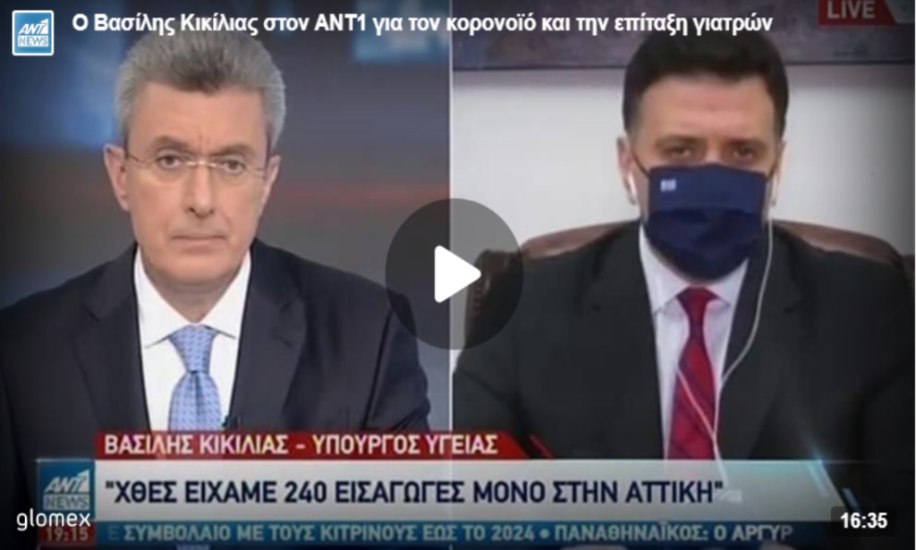 Ο υπουργός Υγείας Βασίλης Κικίλιας μίλησε στο κεντρικό δελτίο ειδήσεων του ΑΝΤ1 για τις δύσκολες ώρες που βιώνει το Εθνικό Σύστημα Υγείας.