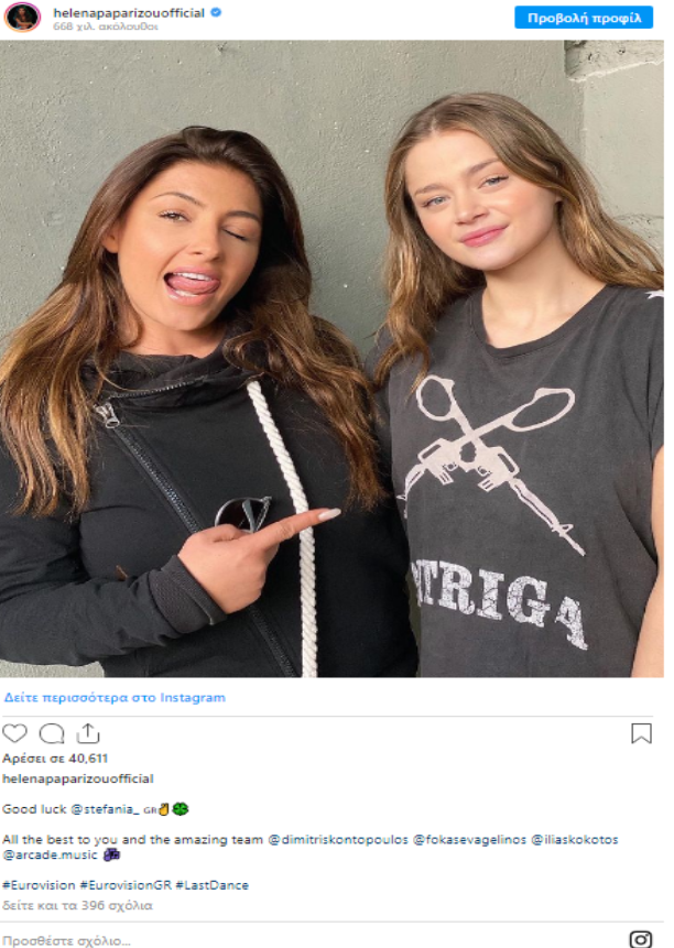 Η Έλενα Παπαρίζου της ευχήθηκε καλή τύχη, με μία ανάρτηση στον προσωπικό της λογαριασμό στο Instangram: “Καλή τύχη, Στεφανία. Τα καλύτερα σε εσένα και στην υπέροχη ομάδα σου”.