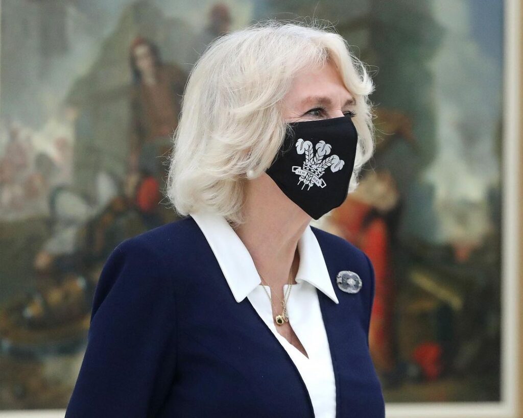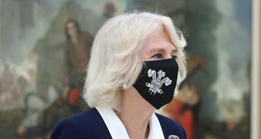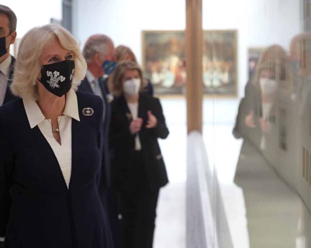 Η Δούκισσα της Κορνουάλης κατά την επίσκεψη τους στην Εθνική Πινακοθήκη φόρεσε μία μαύρη μάσκα με το επίσημο έμβλημα του συζύγου της.