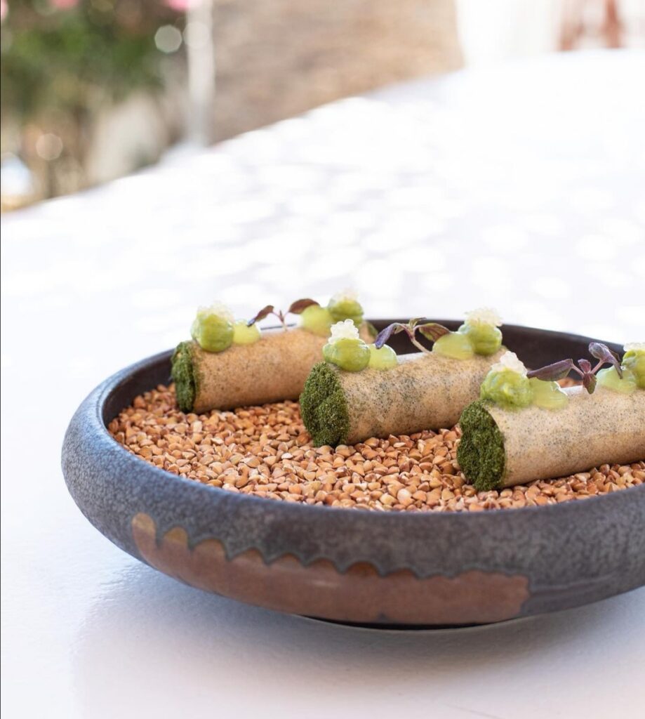 1) Κανελλόνι από feuille de brick με ταρτάρ μαγιάτικο, finger lime και κόλιανδρο