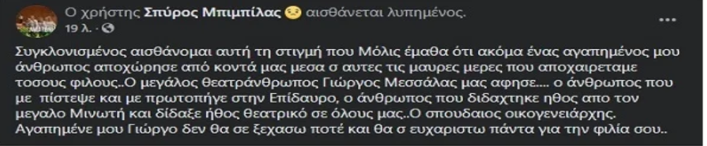 Πέθανε ο ηθοποιός και σκηνοθέτης Γιώργος Μεσσάλας, την είδηση την έκανε γνωστή ο ηθοποιός Σπύρος Μπιμπίλας.