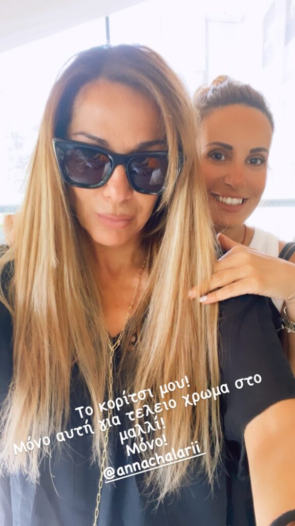 Όπως αναφέρει η colorist Άννα Χάλαρη, άνοιξε τα μαλλιά της με τη μέθοδο του μπαλαγιάζ και το χρώμα είναι το ανοιχτό ξανθό!