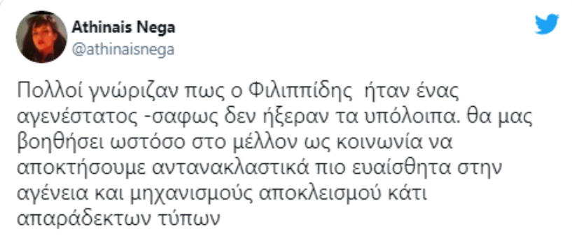 Έγραψε: “Πολλοί γνώριζαν πως ο Φιλιππίδης ήταν ένας αγενέστατος -σαφως δεν ήξεραν τα υπόλοιπα. θα μας βοηθήσει ωστόσο στο μέλλον ως κοινωνία να αποκτήσουμε αντανακλαστικά πιο ευαίσθητα στην αγένεια και μηχανισμούς αποκλεισμού κάτι απαράδεκτων τύπων”