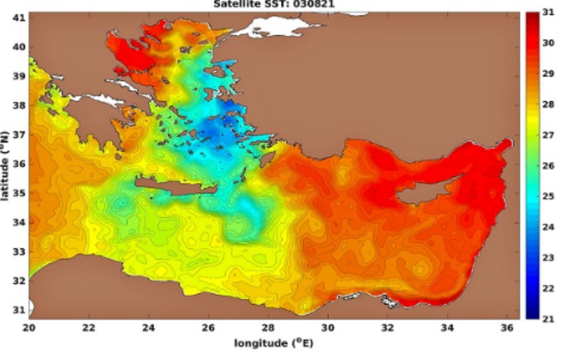 Εις επίρρωση της παραπάνω εξήγησης, ο παρακάτω χάρτης δείχνει τη θερμοκρασία του νερού στην ανατολική Μεσόγειο, σύμφωνα με το Εθνικό Καποδιστριακό Πανεπιστήμιο Αθηνών.