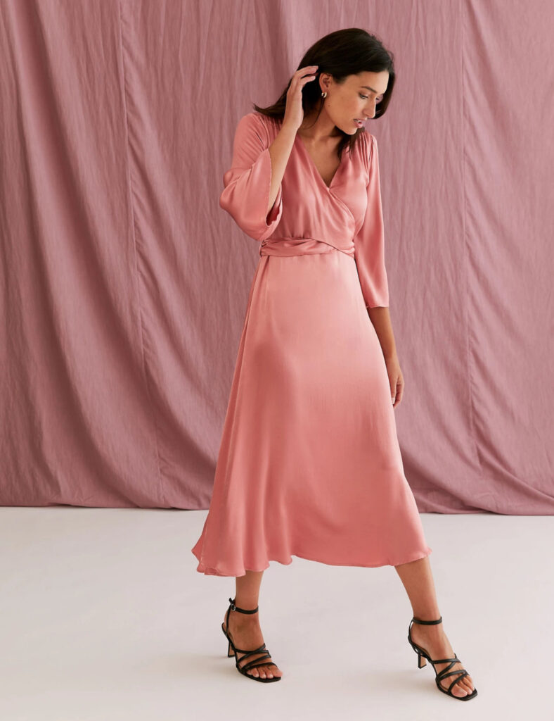 Το φόρεμα είναι midi, κρουαζέ και σατέν.