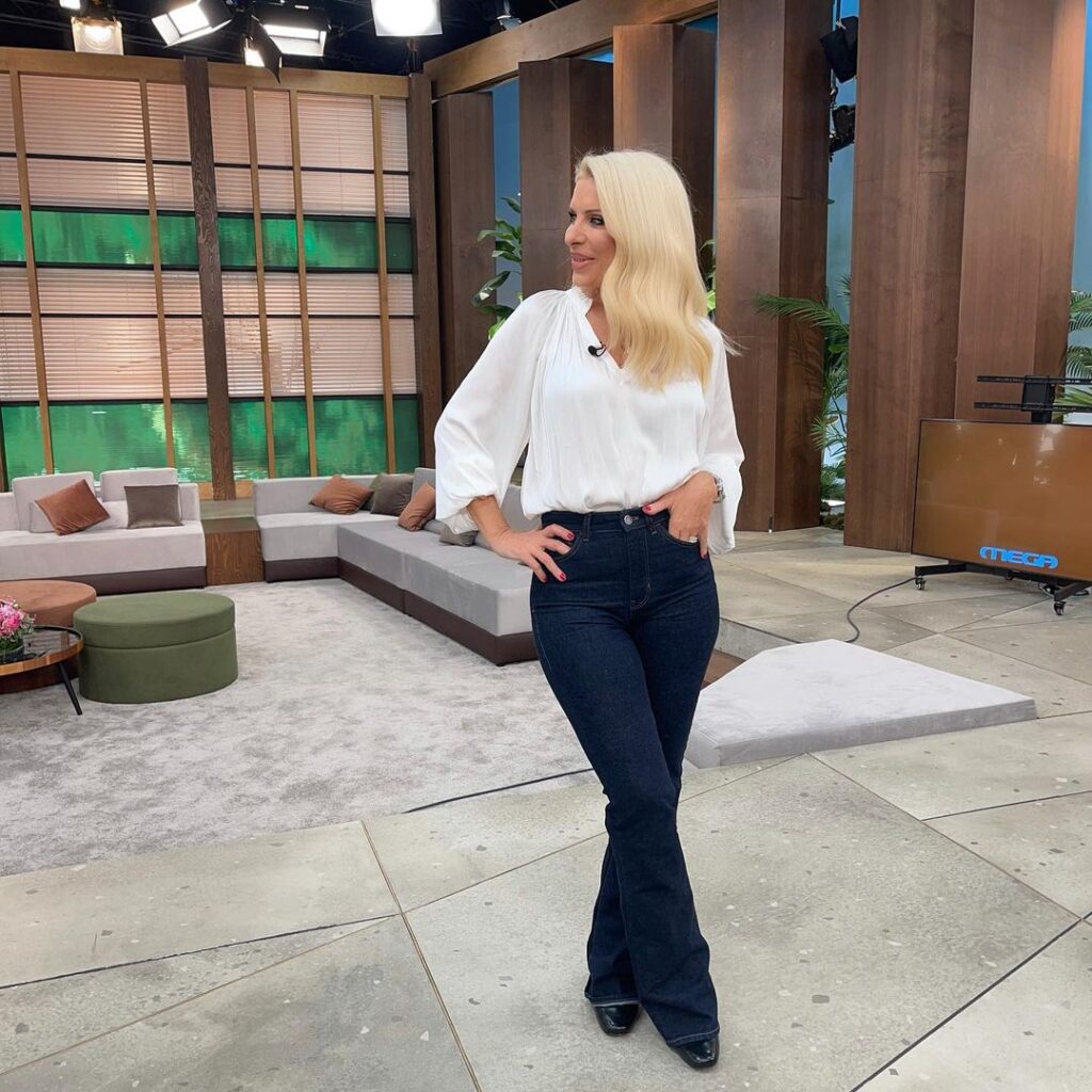 Οπως θα δεις και εσύ, η παρουσιάστρια επέλεξε ένα μπλε σκούρο τζιν και μια αέρινη εκρού πουκαμίσα με διακριτικό ντεκολτέ.