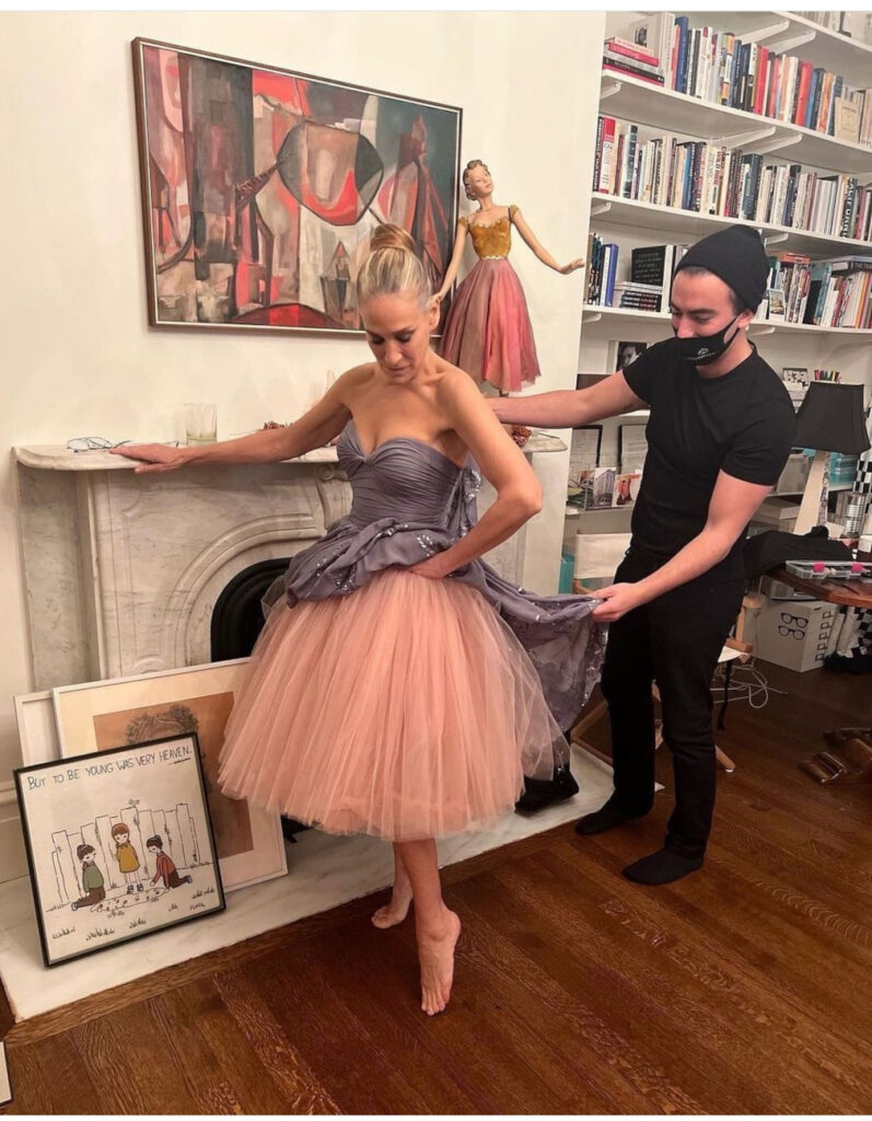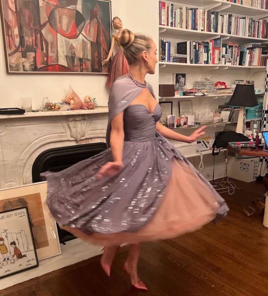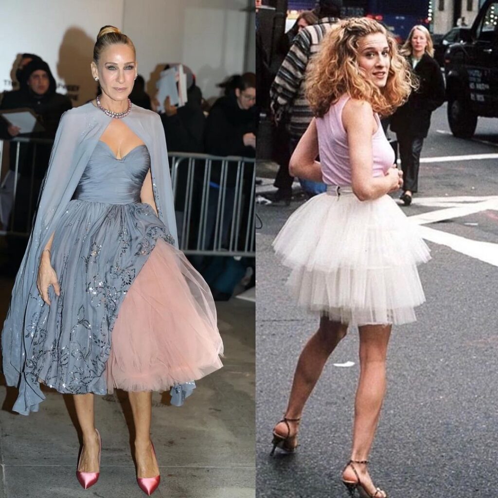 Έτσι, η 56χρονη ηθοποιός εμφανίστηκε στην πρεμιέρα -που πραγματοποιήθηκε στο Μουσείο Μοντέρνας Τέχνης στη Νέα Υόρκη- με ένα custom, γκρι Oscar de la Renta φόρεμα -τον αγαπημένο σχεδιαστή της ηρωίδας της- με τούλινη φούστα σε ροζ απόχρωση και κάπα και ολοκλήρωσε το look της, όχι με Manolo Blahnik, αλλά με ροζ ψηλοτάκουνες γόβες από την δική της σειρά παπουτσιών SJP ενώ φόρεσε κοσμήματα Fred Leighton, Larkspur και Hawk.