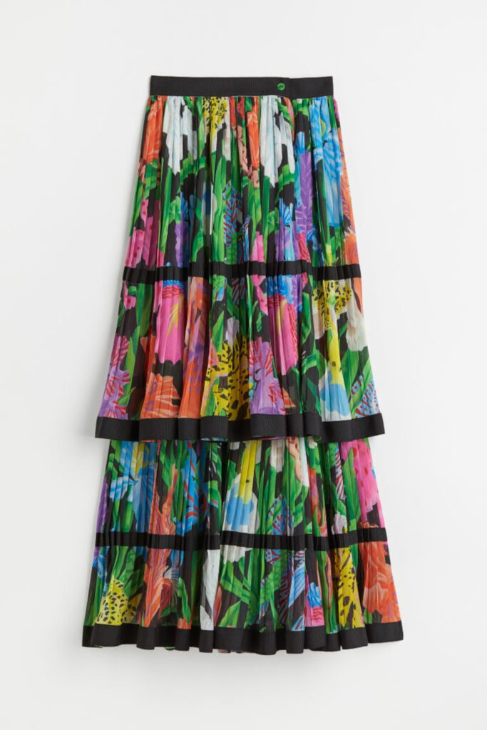 H Tζένη Θεωνά λοιπόν φόρεσε μια αέρινη μπλούζα με έντονα χρώματα και μία μακριά φούστα στο ίδιο μοτίβο από τη νέα συλλογή της H&Μ.