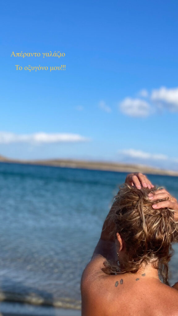 «Απέραντο γαλάζιο, το οξυγόνο μου» σημείωσε η Σοφία Αλιμπέρτη στη λεζάντα της φωτογραφίας της, όπου την βλέπουμε με πλάτη στον φωτογραφικό φακό, να μάς δείχνει τα διακριτικά τατουάζ που έχει στον αυχένα της.