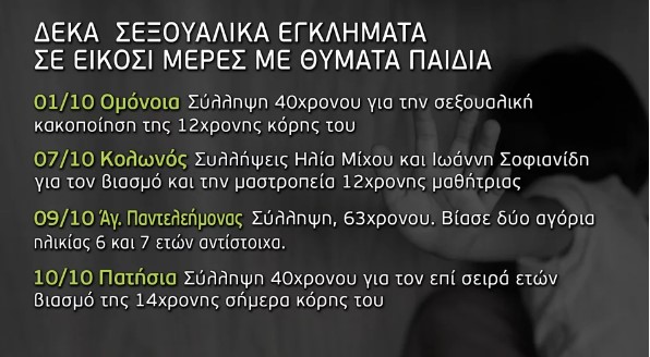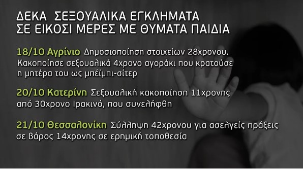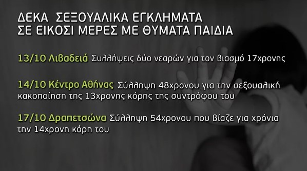 Σύμφωνα με την εκπομπή, το πρώτο εικοσαήμερο του Οκτωβρίου, αποκαλύφθηκαν δέκα υποθέσεις με βιασμούς παιδιών, ακόμα και από τον ίδιο τους τον πατέρα.