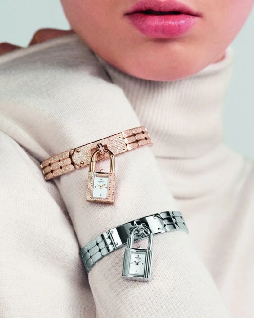 Το brand επανεξετάζει τώρα το ρολόι Kelly , ανεβάζοντάς το σε νέα ύψη πολυτέλειας με ένα μεταλλικό βραχιόλι από χρυσό ή ανοξείδωτο ατσάλι. «Πήραμε το μικρό μεταλλικό πιάτο από την τσάντα και το μετατρέψαμε σε συνδέσμους», εξηγεί ο Philippe Delhotal . Οι γεωμετρικοί σύνδεσμοι δίνουν σε ένα βραχιόλι μια συγκεκριμένη ευελιξία, η οποία, μαζί με τη μείωση του μεγέθους του μάνδαλου, δημιουργεί αυτό που περιγράφει ο Philippe Delhotal ως “πιο θηλυκό κομμάτι, πιο κοντά στο κόσμημα, που μπορείτε να φοράτε ακόμα και καθημερινά” .