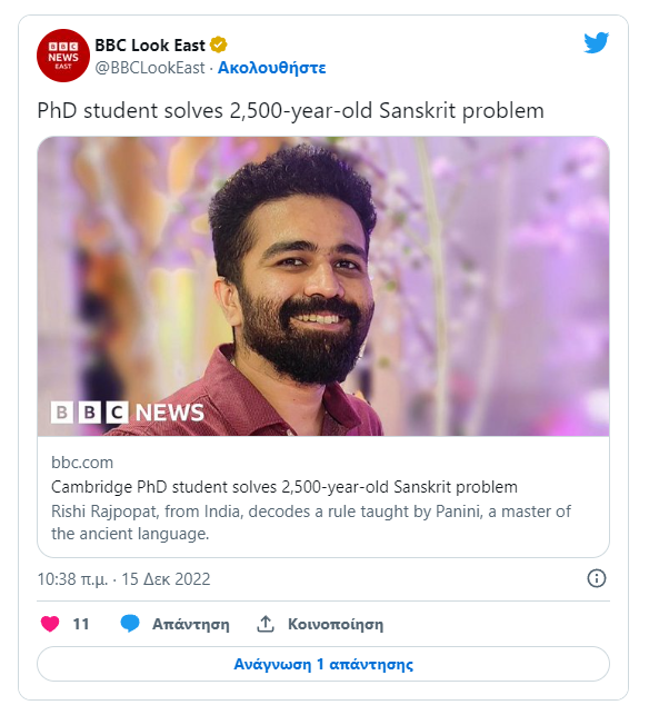 Ο νεαρός φοιτητής, Rishi Rajpopat αποκωδικοποίησε έναν κανόνα που δίδαξε ο Panini, ο μεγάλος δάσκαλος της σανσκριτικής γλώσσας, ο οποίος έζησε τον 4ο αιώνα π.Χ. Σύμφωνα με το ΒΒC, o Rajpopat επεξεργαζόταν το πρόβλημα για εννέα μήνες δίχως αποτέλεσμα, μέχρι που είχε μια στιγμή… “Ευρήκα”