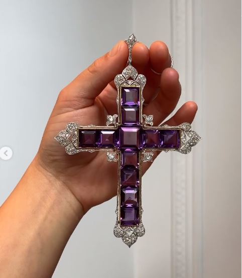 Ο σταυρός από αμέθυστο δημιουργήθηκε από τον σχεδιαστή πολυτελών κοσμημάτων Γκάραρντ, το 1920. Η πριγκίπισσα Νταϊάνα το είχε φορέσει σε πολλές εξόδους της, αλλά και σε ένα φιλανθρωπικό γκαλά στο Λονδίνο τον Οκτώβριο του 1987. Σε εκείνη την εμφάνιση το είχε συνδυάσει με ένα μπαρόκ βελούδινο φόρεμα του οίκου Catherine Walker & Co.