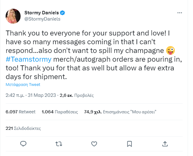 Σχολιάζοντας την απόφαση των ενόρκων στη Νέα Υόρκη, η Στόρμι Ντάνιελς σχολίασε ειρωνικά μέσω Twitter πως δεν θα ήθελε να «της χυθεί η σαμπάνια».