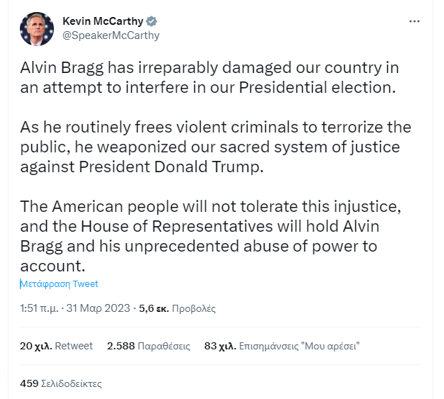 Έτσι, μετά την ιστορική αυτή απόφαση, ο Τραμπ γίνεται ο πρώτος πρώην Πρόεδρος της Αμερικής, που ασκείται εις βάρος του ποινική δίωξη. Μία απόφαση που έχει προκαλέσει αίσθηση και πανικό στο Μανχάταν, όπως και στο ρεπουμπλικανικό κόμμα κάνοντας λόγο για “πολιτική δίωξη”.