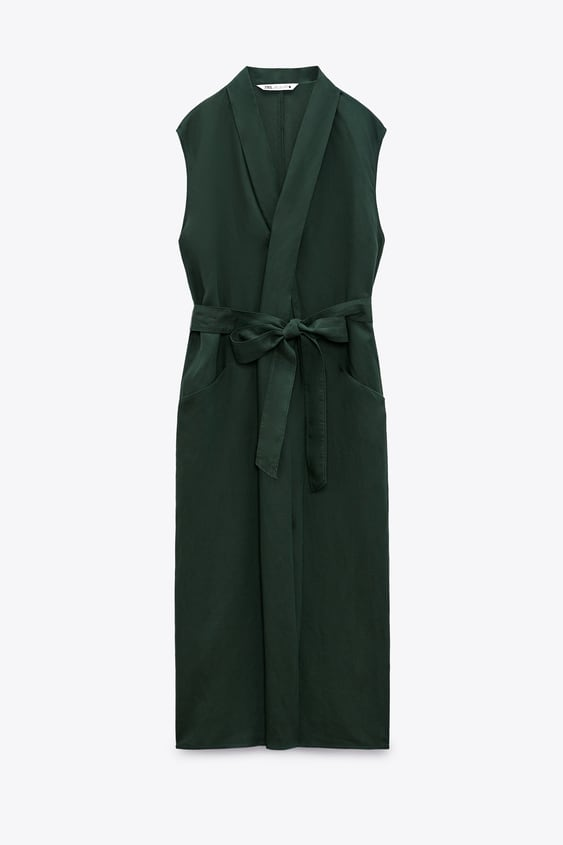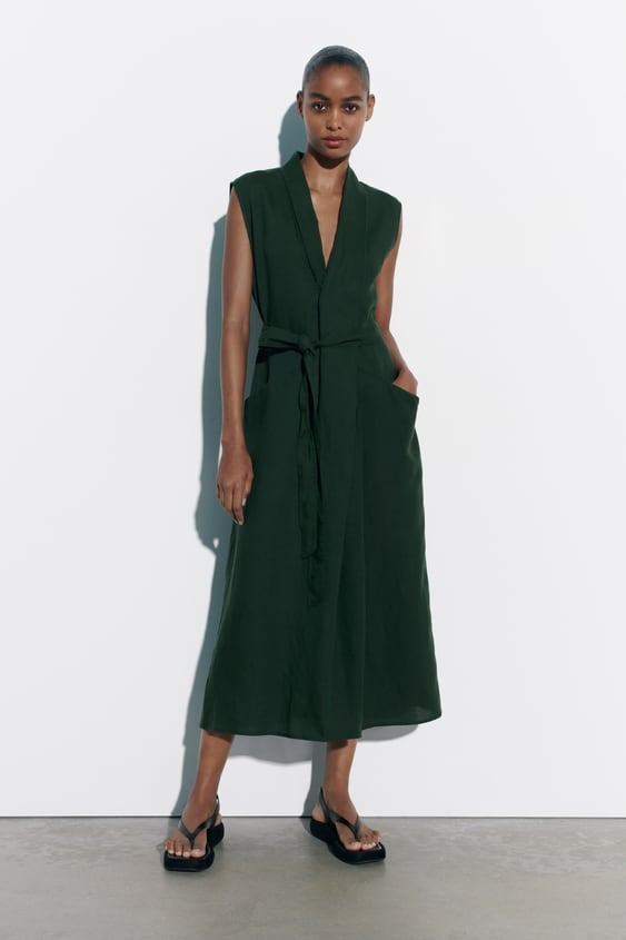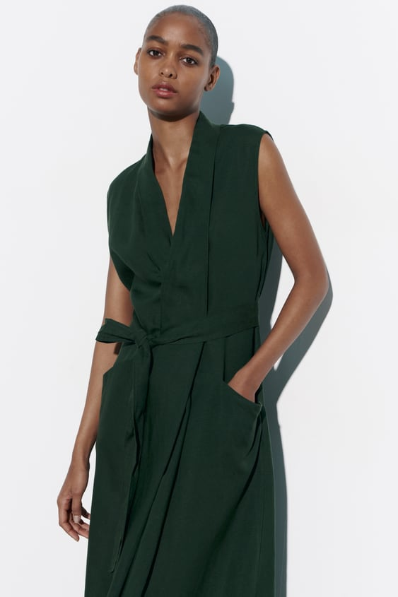 Το κυπαρισσί φόρεμα από τα Zara που ξεπουλάει. Μίντι φόρεμα από ύφασμα με μείγμα λινού. Αμάνικο με V λαιμόκοψη, έχει προστινές τσέπες και δετή ζώνη από το ίδιο ύφασμα. Κλείνει μπροστά με κουμπιά που καλύπτονται από πατιλέτα.