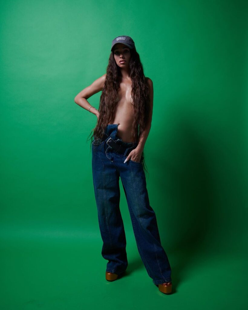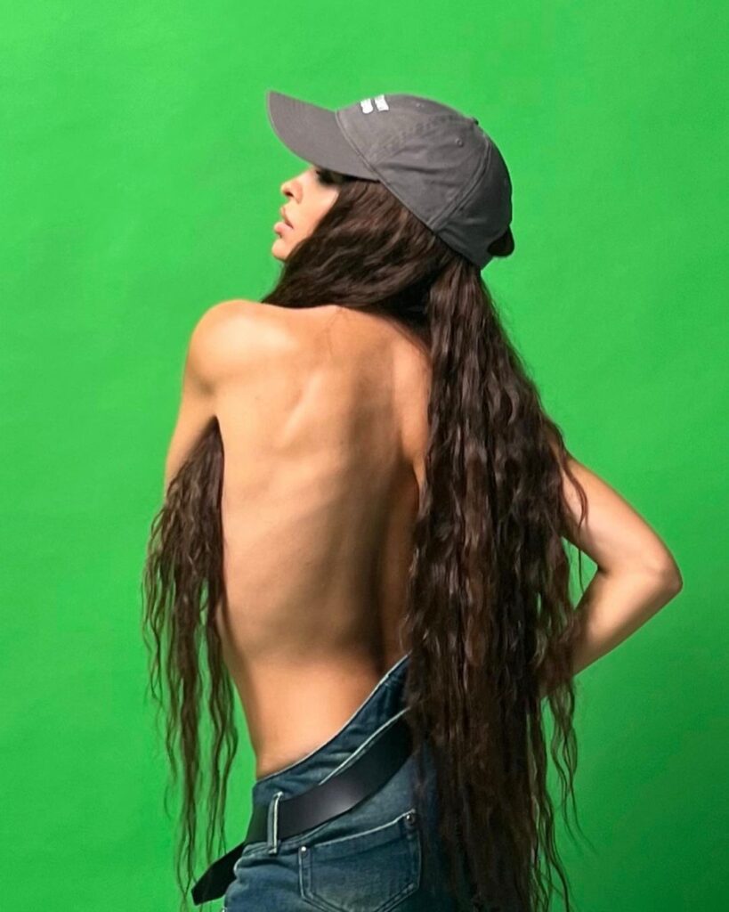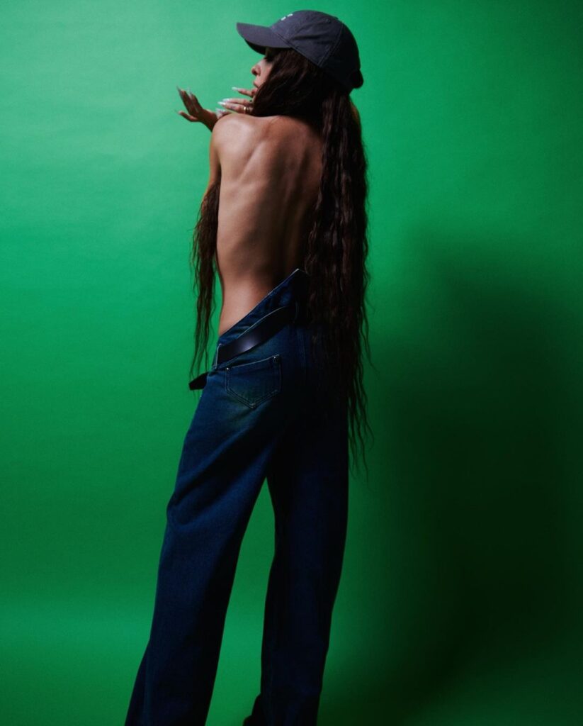 Φορά μόνο ένα τζιν παντελόνι και ένα καπέλο τύπου τζόκεϊ, ενώ το γυμνό στήθος της καλύπτουν τα μαλλιά της.