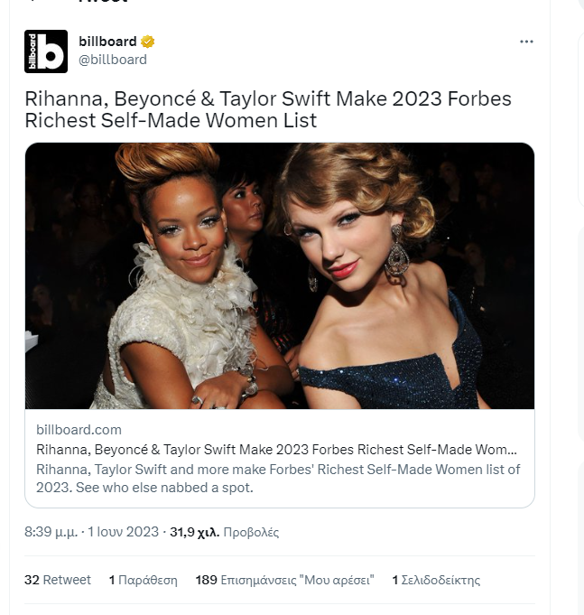 Στις κορυφαίες θέσεις της φετινής λίστας του Forbes, συναντάμε τη Rihanna, την Taylor Swift και τη Beyonce.