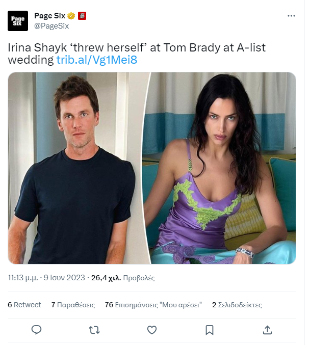 Σύμφωνα με ένα νέο δημοσίευμα, το πανέμορφο μοντέλο έχει γοητευτεί από τον Τομ Μπρέιντι κι επιδιώκει να έρθει πιο κοντά του. Συγκεκριμένα, όπως αναφέρει δημοσίευμα της Page Six, η Ιρίνα Σάικ έχει στρέψει το ενδιαφέρον της προς τον άσο του NFL.