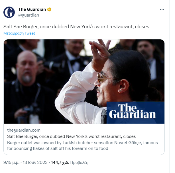 Αλλά αυτή τη στιγμή, ο Salt Bae βρίσκεται στην πιο δύσκολη φάση της επαγγελματικής του ζωής, καθώς έβαλε “λουκέτο” στο εστιατόριό του στη Νέα Υόρκη και συγκεκριμένα στο κοσμοπολίτικο Μανχάταν. Μια εξέλιξη που έρχεται μετά τις καταγγελίες ατόμων που ήταν στο προσωπικό του για τις κάκιστες συνθήκες εργασίας.
