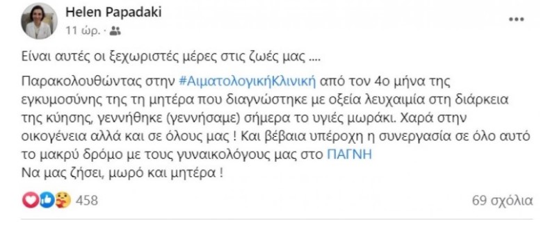 «Είναι αυτές οι ξεχωριστές μέρες στις ζωές μας… Παρακολουθώντας στην Αιματολογική Κλινική από τον 4ο μήνα της εγκυμοσύνης της τη μητέρα που διαγνώστηκε με οξεία λευχαιμία στη διάρκεια της κύησης, γεννήθηκε (γεννήσαμε) σήμερα το υγιές μωράκι. Χαρά στην οικογένεια αλλά και σε όλους μας. Και βέβαια υπέροχη η συνεργασία σε όλον αυτό τον μακρύ δρόμο με τους γυναικολόγους μας στο ΠΑΓΝΗ. Να μας ζήσει, μωρό και μητέρα», έγραψε χαρακτηριστικά.