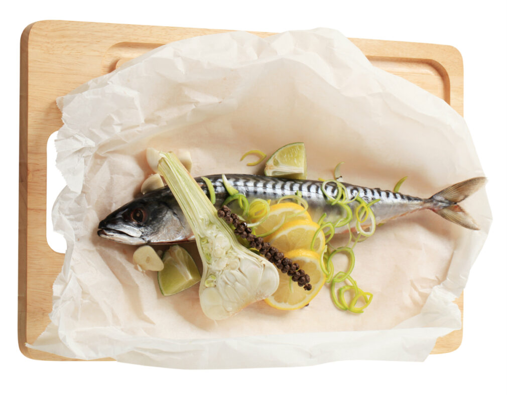 • Τυλίγετε τη λαδόκολλα σφιχτά και την κλείνετε με ένα σπάγκο. Τοποθετείτε τη λαδόκολλα με τον κολιό σε ένα ταψί και ψήνετε σε προθερμασμένο φούρνο στους 200 °C για 15 λεπτά. Στη συνέχεια ανοίγετε τη λαδόκολλα και συνεχίζετε το ψήσιμο για ακόμα 5 λεπτά. Αποσύρετε από το φούρνο, αφήνετε τον κολιό να σταθεί για 5 λεπτά και σερβίρετε.