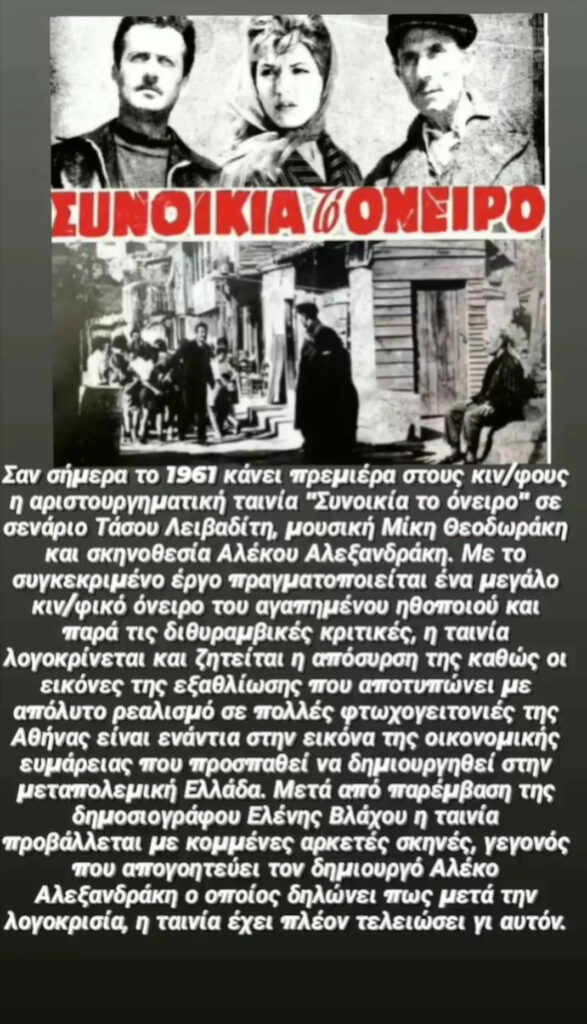 Η θρυλική ταινία «Συνοικία το Όνειρο» που σκηνοθέτησε ο Αλέκος Αλεξανδράκης το 1961, σε σενάριο του σπουδαίου ποιητή Τάσου Λειβαδίτη και του Κώστα Κοτζιά πέρασε μεγάλες περιπέτειες και κυρίως λογοκρισία και μάλιστα εν καιρώ δημοκρατικού πολιτεύματος.