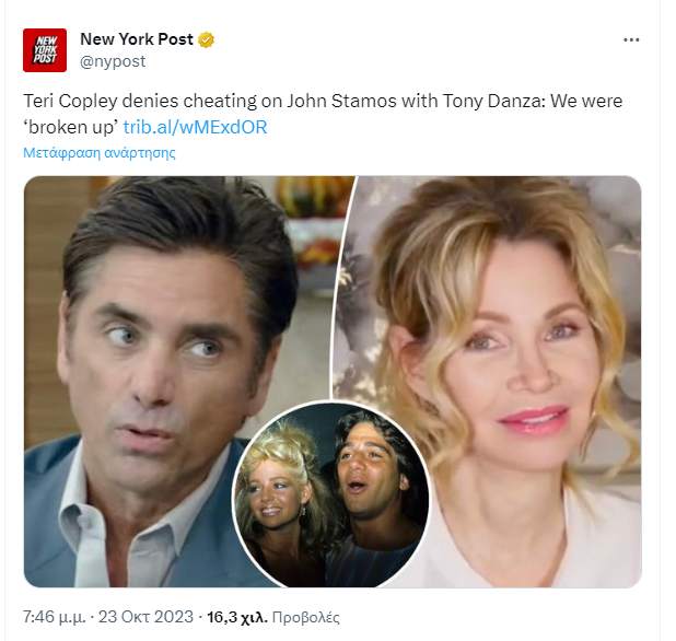 Ο Τζον Στάμος στα απομνημονεύματά του αποκάλυψε για πρώτη φορά, την απιστία της πρώην συντρόφου του, Τέρι Κόπλεϊ, τη δεκαετία του 1980. Ο Ελληνοαμερικανός ηθοποιός στο βιβλίο για τη ζωή του, προχωράει σε πολύ προσωπικές αποκαλύψεις, μεταξύ αυτών και την απιστία της πρώην συντρόφου του, την οποία αναδημοσιεύει το People.