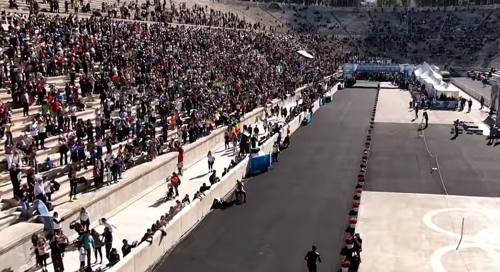 Ο ηλικιωμένος δρομέας έφτασε στο Καλλιμάρμαρο από τον Μαραθώνα μετά από 8 ώρες και 43 λεπτά και την ώρα που τερμάτισε, τον πλησίασαν διασώστες του Ερυθρού Σταυρού για να δουν εάν χρειάζεται κάτι.
