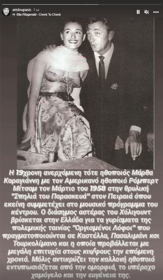 Ο δημοσιογράφος και συλλέκτης, Άρης Λουπάσης, δημοσίευσε στον προσωπικό του λογαριασμό στο Instagram μια σπάνια φωτογραφία της Μάρθας Καραγιάννη με τον ηθοποιό του Χόλιγουντ, Ρόμπερτ Μίτσαμ. Η αξέχαστη ηθοποιός ήταν τότε μόλις 19 ετών και βρισκόταν ουσιαστικά στο ξεκίνημα της καριέρας της. Με την ομορφιά της και το χαμόγελό της εντυπωσίασε τον διάσημο αστέρα του Χόλιγουντ.