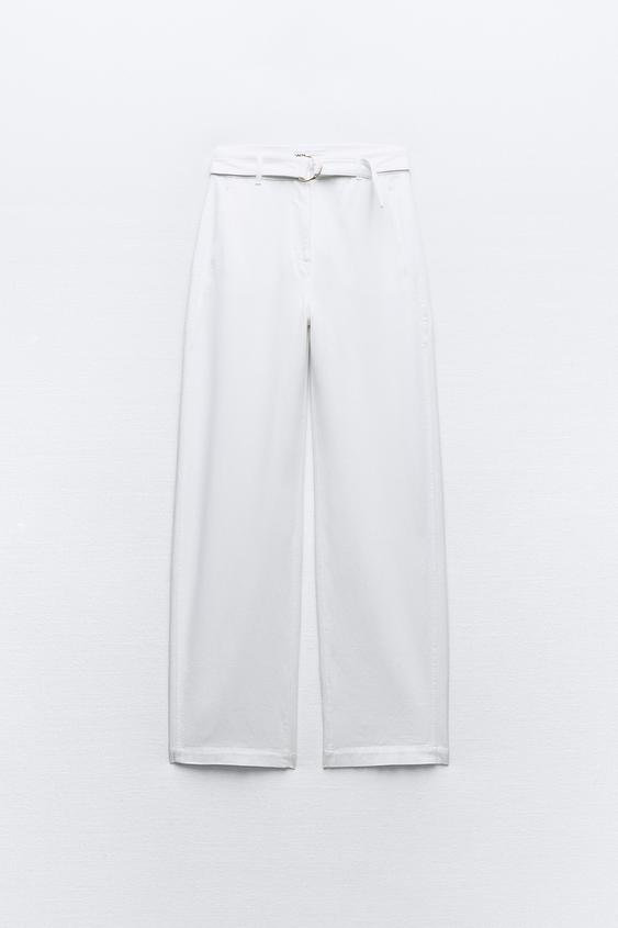 Το λευκό παντελόνι από τα Zara είναι το απόλυτο fashion item της άνοιξης. Ψηλόμεσο παντελόνι με ασορτί ζώνη, έχει μπροστινές τσέπες και ψεύτικες πίσω τσέπες με ρέλι. Το μπατζάκι είναι ίσιο και μακρύ, Κλείνει μπροστά με φερμουάρ και κουμπί. Μπορεί να γίνει δικό σου μόνο με 39,95 ευρώ.