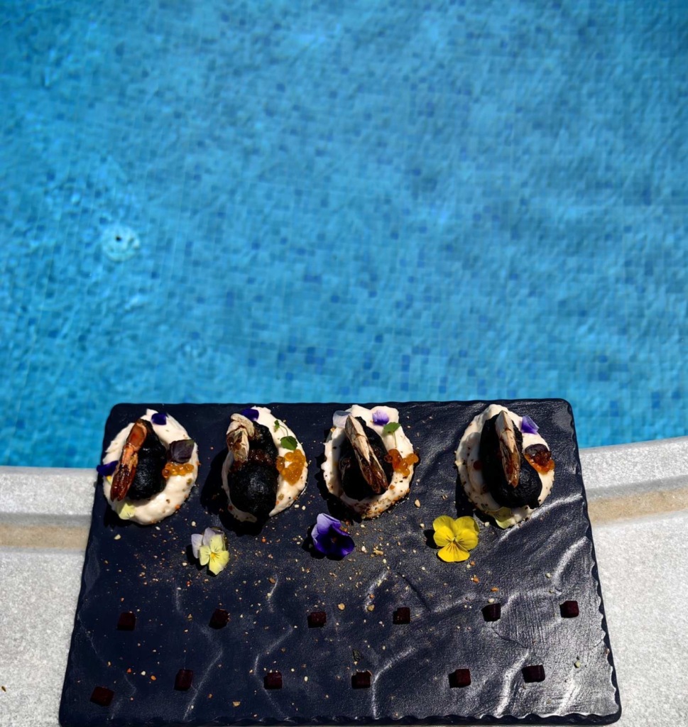 Γαρίδα τεμπούρα σε κρούστα από μελάνι σουπιάς με συμοδεία λευκού ταραμά, παντζάρι και μαρμελάδα πορτοκάλι