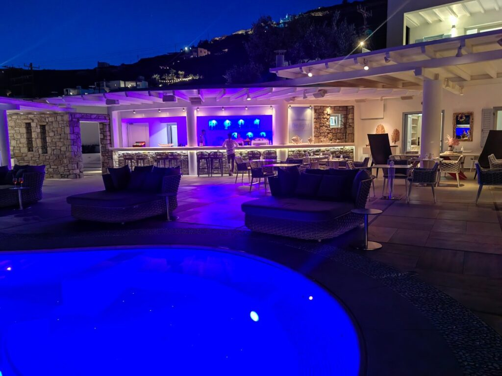 Κάντε μια δροσιστική βουτιά στην πισίνα έχοντας συγκλονιστική θέα στο Αιγαίο και στη Δήλο και χαλαρώστε στα άνετα sunbeds  απολαμβάνοντας τον ήλιο αλλά και ένα martini… όπως και το καθαρό μπλε του ουρανού που λάμπει στο μαγευτικό αστραφτερό νερό της πισίνας. Απολαύστε τη γλυκιά αδράνεια, ξεκουραστείτε, ακούστε ατμοσφαιρική μουσική,  δροσιστείτε με έναν φρέσκο χυμό ή ένα cocktail, θαυμάστε το υπέροχο τοπίο…Εδώ μπορείτε να περάσετε αβίαστα όλη την ημέρα βλέποντας τα χρώματα να αλλάζουν από το πρωί στο μεσημέρι και μετά στο ηλιοβασίλεμα. Όταν φτάσει το βράδυ και με την απαλή λάμψη των φώτων της πισίνας, τα αστέρια στον ουρανό δημιουργούν μια ακόμα μαγευτική εικόνα…