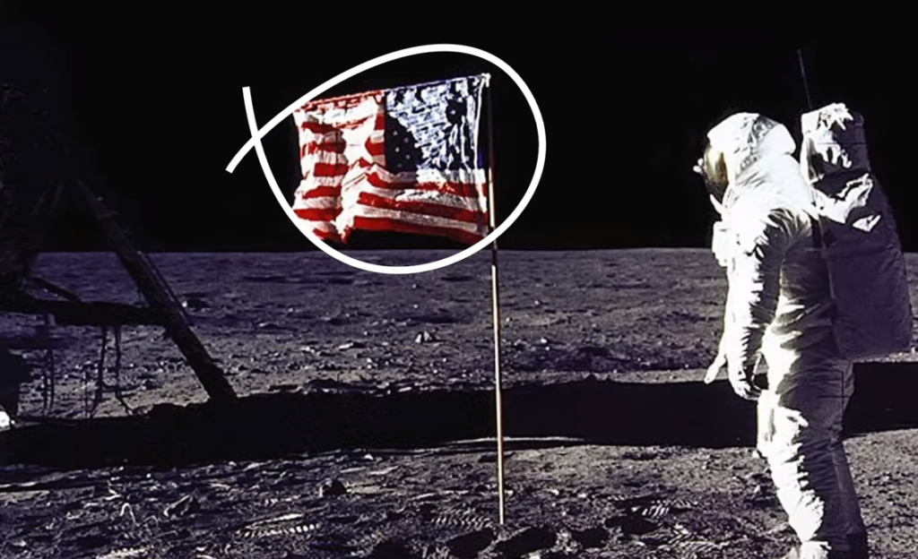 Ο Άρμστρονγκ καρφώνει την αμερικανική σημαία στο έδαφος της Σελήνης και εκείνη μοιάζει να κυματίζει. Κάτι που είναι αδύνατον να συμβεί, αφού δεν υπάρχει αέρας. Η απάντηση που έχει δώσει η NASA είναι ότι ο Όλντριν έστριψε τον στύλο της σημαίας, για να την καρφώσει στο έδαφος και το ύφασμα κουνήθηκε. Επειδή όμως στη σελήνη, όλες οι κινήσεις γίνονταν πιο αργά, όταν τραβήχτηκε η φωτογραφία, η σημαία «κυμάτιζε» ακόμα.