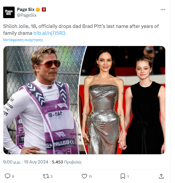 Η δικαστική απόφαση, σύμφωνα με το Page Six, δείχνει ότι ένας δικαστής υπέγραψε την αλλαγή το πρωί της Δευτέρας 19 Αυγούστου και το όνομά της άλλαξε από Σιλό Νουβέλ Τζολί Πιτ σε Σιλό Νουβέλ Τζολί.
