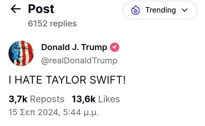 Τόσο που ο Ντόναλντ Τραμπ ξεσπάθωσε κατά της Τέιλορ Σουίφτ, γράφοντας με κεφαλαία γράμματα στο μέσο κοινωνικής δικτύωσης, Truth Social: «ΜΙΣΩ ΤΗΝ ΤΕΙΛΟΡ ΣΟΥΙΦΤ!».
