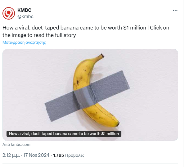 Η κίτρινη μπανάνα, κολλημένη σε λευκό τοίχο με ταινία, είναι το έργο «Comedian», του Ιταλού καλλιτέχνη Maurizio Cattelan. Πρωτοπαρουσιάστηκε το 2019 στην Art Basel στο Μαϊάμι, όπου προκάλεσε έντονες συζητήσεις και έκανε αίσθηση.
