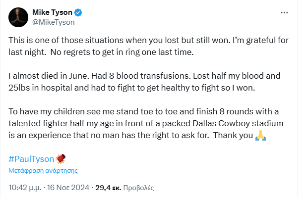 Σε ανάρτησή του στο Χ, ο Μάικ Τάισον αποκάλυψε για πρώτη φορά πως τον περασμένο Ιούνιο έφτασε πολύ κοντά στον θάνατο.