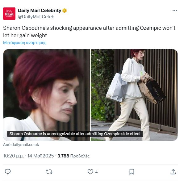 Η Σάρον Όσμπορν, άλλωστε, έχει παραδεχτεί πως κατέφυγε στη χρήση του Ozempic για να χάσει βάρος, όμως είχε αρνητικές επιπτώσεις στην υγεία της. Αν και στην αρχή είχε εκφράσει ικανοποίηση για τα αποτελέσματα μετά την έναρξη της αγωγής, τον Δεκέμβριο του 2022, αργότερα αποκάλυψε πως είχε ξεπεράσει τα όρια.