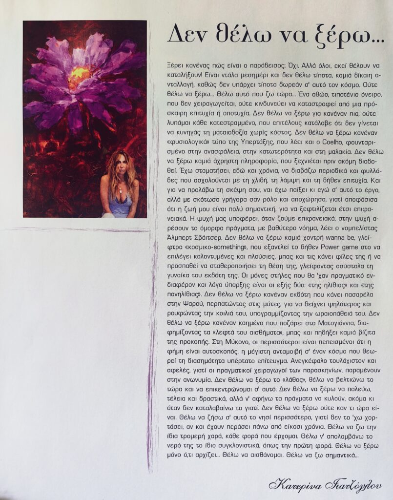 Δεν θέλω να ξέω ούτε καν τι ώρα είναι. Θέλω να ζήσω σ’ αυτό το νησί περισσότερο, γιατί δεν το ‘χω χορτάσει, αν και έχουν περάσει πάνω από είκοσι χρόνια. Θέλω να ζω την ίδια τρομερή χαρά, κάθε φορά που έρχομαι. Θέλω ν’ απολαμβάνω το νερό της το ίδιο συγκλονιστικά, πως την πρώτη φορά, Θέλω να ξέρω μόνο ό,τι αρχίζει… Θέλω να αισθάνομαι. Θέλω να ζω σημαντικά…