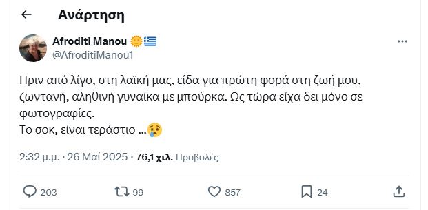 Όπως έγινε και με μια πρόσφατη ανάρτησή της στο Χ, όπου η Αφροδίτη Μάνου αναφέρθηκε στη συνάντησή της -για πρώτη φορά στη ζωής της, όπως σημειώνει – με μία γυναίκα που φορούσε μπούρκα στη λαϊκή. Ένα σχόλιο που όμως, δεν άρεσε σε κάποιους χρήστες, οι οποίοι και αντέδρασαν.