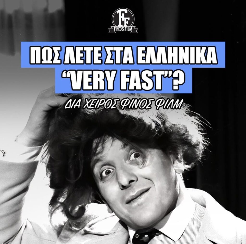 «Κάπου το διαβάσαμε και αποφασίσαμε να το κάνουμε reel (σύντομο βιντεάκι). Όταν οι τουρίστες ρωτάνε πώς λέγεται το «very fast στα ελληνικά», γράφει η Φίνος Φίλμ στo προφίλ της στο Instagram. Η θρυλική εταιρεία παραγωγής με ένα ξεκαρδιστικό κολάζ ταινιών παρουσιάζει λέξεις που σημαίνουν στα ελληνικά «very fast» δια στόματος σπουδαίων και αγαπημένων ηθοποιών.