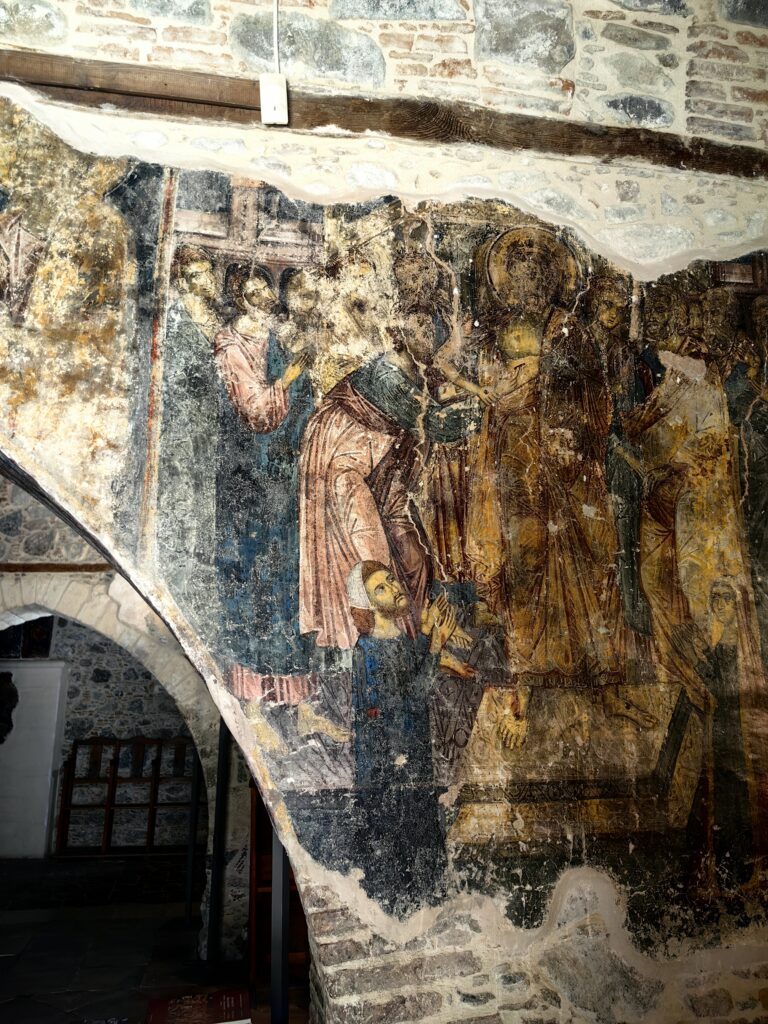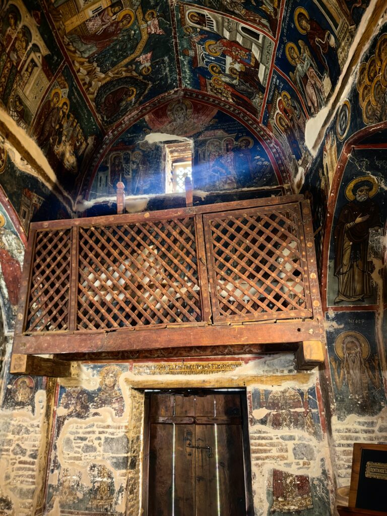 Μέσα στην απόλυτη ησυχία του ναού, ο χρόνος μοιάζει να έχει σταματήσει. Οι τοιχογραφίες ζωντανεύουν μπροστά στα μάτια σου: η Γέννηση του Χριστού, τα Εισόδια, η Γενεαλογία Του, η Απιστία του Θωμά – όλες αποτυπωμένες με χρώματα που αντέχουν στον χρόνο.