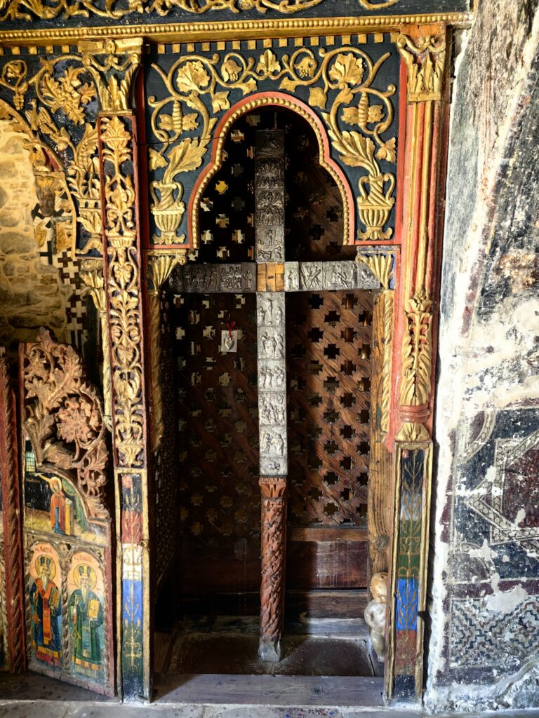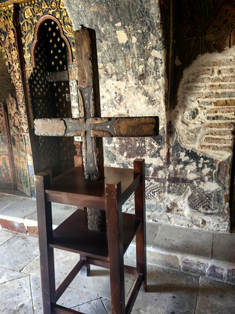 Το πιο ιερό σημείο της εκκλησίας είναι το εικονοστάσιο, όπου δεσπόζει ένας επίχρυσος Σταυρός. Η παράδοση λέει πως στο εσωτερικό του φυλάσσεται τεμάχιο του Τιμίου Ξύλου. Το δέος είναι αναπόφευκτο, ακόμη κι αν απλώς στέκεσαι μπροστά του.